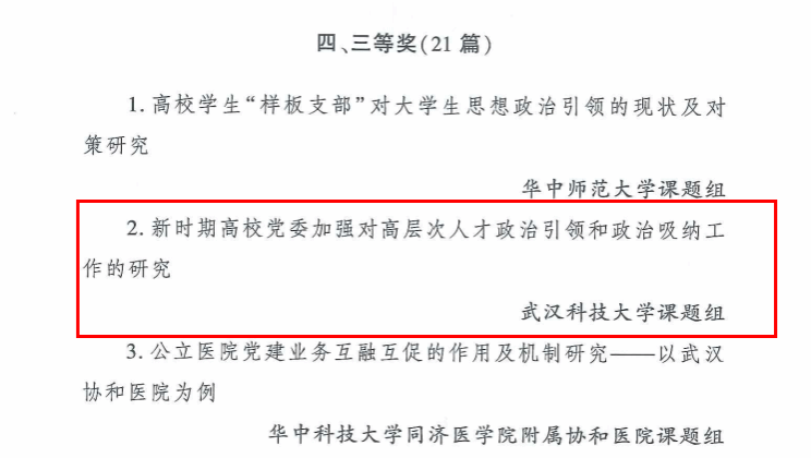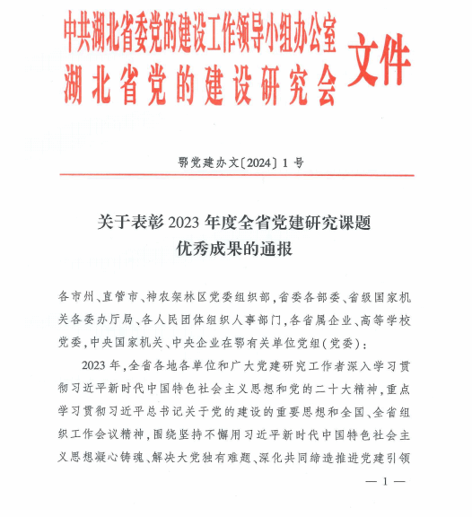 近日,中共湖北省委党的建设工作领导小组办公室、湖北省党的建设研究会印发《关于表彰2023年度全省党建研究课题优秀成果的通报》,由党委巡察办主任(时任公司党委副书记)毛晓丹主持的课题《新时期高公司党委加强对高层次人才政治引领和政治吸纳工作的研究》荣获2023年度全省党建研究课题优秀成果“三等奖”。