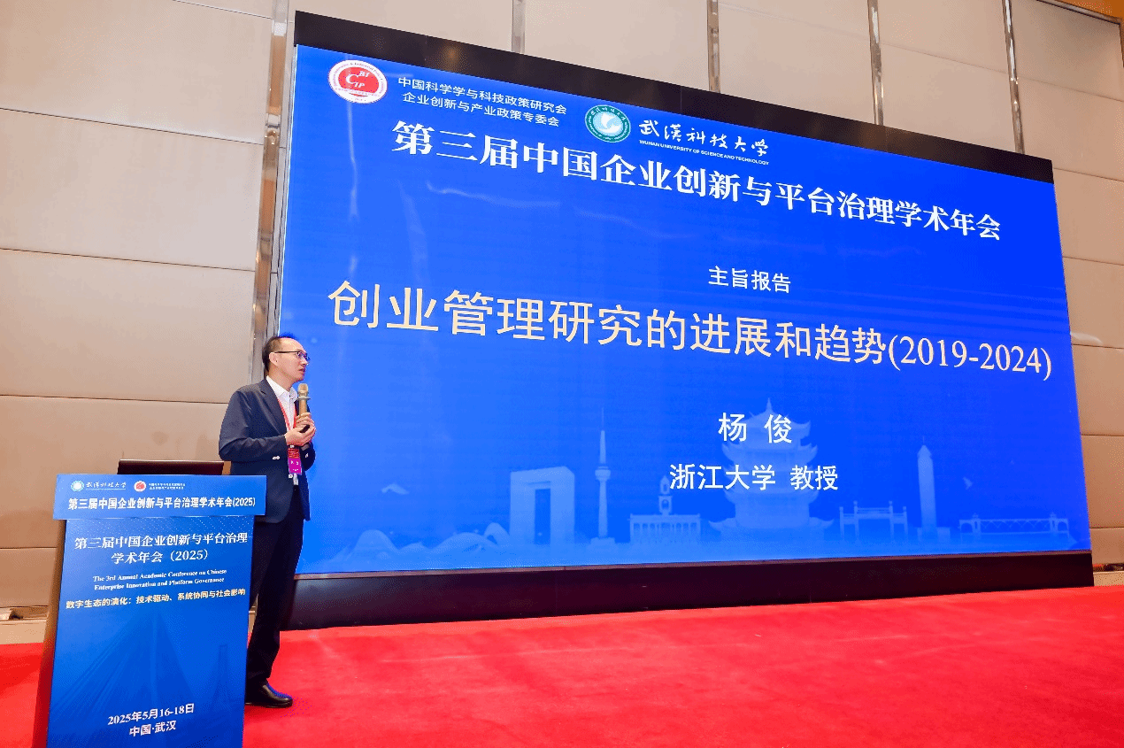 浙江大学杨俊教授作题为“创业管理研究的进展和趋势(2019-2024)”主旨报告。杨俊指出,过去十年间,创业研究领域经历了显著变革,研究范式加速从单一主体视角转向复杂生态系统分析。随着数字技术的深度渗透,创业研究与组织理论、战略管理及技术创新的融合愈发紧密,催生在创业创新领域的新范式。