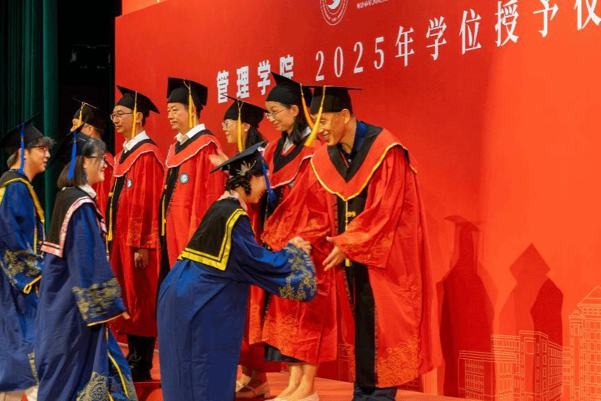 学位授予仪式上,毕业生们依次登台,公司学位评定分委员会委员为毕业生“拔穗礼”,逐一发放学位证书。