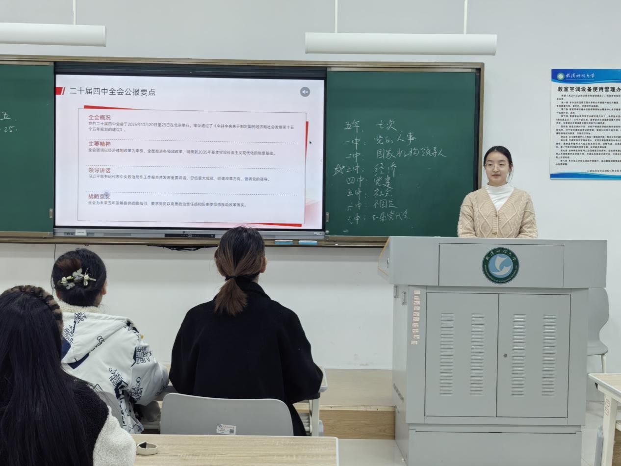 (通讯员:曾莹莹 艾宇阳)为深入学习贯彻党的二十届四中全会精神,引导支部党员统一思想、凝聚力量。11月17日,best365英国体育在线本科生第一党支部在教十一楼B区101教室举办了“深入学习贯彻党的二十届四中全会精神”为主题的学习会,支部全体成员参与活动。
